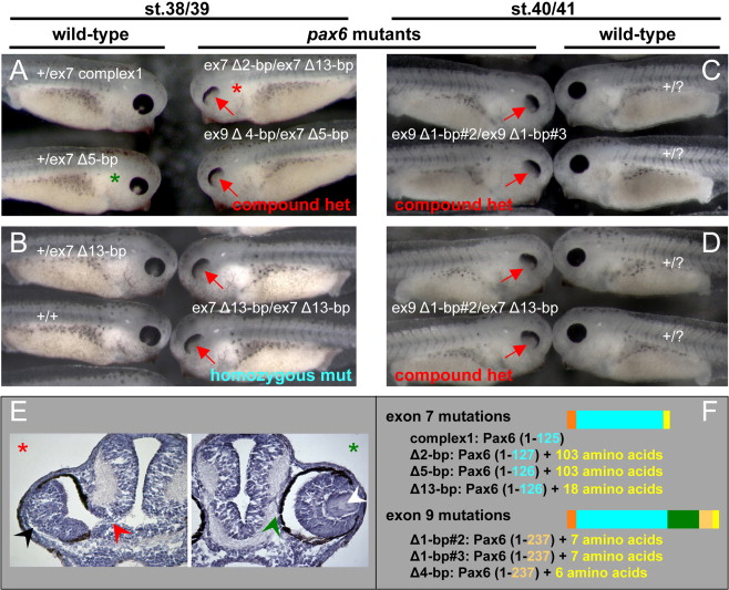 Fig. 4. Xenopus pax6 mutants have abnormal eyes without lenses. (AâD) Offspring from crosses between F0 mosaic mutation carriers (A) or F1 carriers (BâD) showed a consistent phenotype in the eye (red arrows) regardless of the genotype of mutant alleles. F0 crosses (st.716 female #2 x male #3) created a variety of combinations of genotypes in mutant offspring (A), whereas 25% of offspring from F1 crosses (i.e., parents are not mosaic) have a single homozygous (B) or compound heterozygous (C,D) mutant genotype as expected. Note that mutants homozygous for a 13-bp deletion in exon 7 (B) are indistinguishable from other compound heterozygous mutants, regardless of the combination of exon 7 mutations (A, top right embryo), combination of exon 7 and exon 9 mutations (A, bottom right embryo and D), or combination of exon 9 mutations (C). Each embryo shown here was genotyped except for phenotypic wild-type embryos in C and D, thus shown as +/?. Judging from the mutation profiles (see Table S1), we could infer the origins of mutated alleles of offspring from F0 crosses, or in the case of F1 crosses, the genotypes of parents are known in advance, thus we show offspring genotypes in order of parental female locus/male locus except for the top wild-type embryo in (B), where the parental origin of alleles is undeterminable. Actual sequences of mutations can be found in Table S1. (E) Cross sections of embryos marked by red (mutant) and green (wild-type) asterisks in (A) to show morphology of the eyes. The wild-type embryo (green asterisk) has a lens (white arrowhead) and the retina is surrounded by retinal pigment epithelial (RPE) and separated from the brain (green arrowhead), whereas the mutant embryo (red asterisk) has no lens and the retina is disorganized (black arrowhead) and still connected to the brain (red arrowhead). (F) Schematic presentation of proteins encoded by the mutations shown here. Also refer to Fig. 1 for color codes. Exon 7 mutations cause truncation at the C-terminus of the paired domain (located between amino acid residues 4â131), whereas exon 9 mutations cause truncation in the middle of the homeodomain (located between amino acid residues 212â272). Truncations in many cases but not all are followed by unrelated amino acids due to the frameshift. Note that mutant embryos shown in (C) make almost identical mutant proteins with only one amino acid change at position 238, thus this is very close to being a homozygous mutation. (For interpretation of the references to color in this figure legend, the reader is referred to the web version of this article.) |