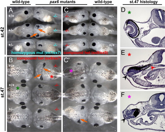 Fig. 5. Phenotypes of Xenopus pax6 mutants at tadpole stages. (A) Phenotypes of F2 embryos at stage 42 from an intercross of F1 heterozygotes carrying a 13-bp deletion in exon 7. â/â, homozygous mutant; +/â, heterozygous; +/+, wild-type. These are siblings of embryos shown in Fig. 4B. (B) Phenotypes of F2 embryos at stage 47 from cross between an F1 female carrying a 1-bp deletion ( #2) in exon 9 and an F1 male carrying a 13-bp deletion in exon 7. â/â, compound heterozygous mutant (genotype is ex9 δ1-bp#2/ex7 δ13-bp); +/â, heterozygous (genotype, +/ex7 δ13-bp); +/+, wild-type. These are siblings of embryos shown in Fig. 4D. (C and Câ²) Phenotype of F2 embryos at stage 42 (C) and stage 47 (Câ²) from mating of an F1 female carrying a 1-bp deletion (#2) in exon 9 and F1 male carrying a 1-bp deletion (#3) in exon 9. Embryos shown in C (mixture of lateral and dorsal views) are the same embryos as shown in Câ² (all dorsal views) at the same axial position, the only difference being their ages. â/â, compound heterozygous mutant (genotype is ex9 δ1-bp#2/ex9 δ1-bp#3); +/â, heterozygous wild-type (genotype, ex9 δ1-bp#2/+ for top embryo, +/ex9 δ1-bp#3 for second embryo); +/+, homozygous wild-type. These are siblings of embryos shown in Fig. 4C. Orange arrows show the eye fused to the brain, which is often, but not always, seen in pax6 mutants regardless of genotype. (DâF) Cross sections of the eye region of embryos shown in (B) and (Câ²). Corresponding embryo and section are marked by the same colored asterisks. Wild-type embryos (D) have well organized retina and lens (white arrowhead), whereas mutants (E and F) do not have lens and the retina is disorganized (black arrowheads). By this stage, mutant eyes were separated from the brain in some embryos (F) or still connected to the brain in other embryos (E, red arrowhead). (For interpretation of the references to color in this figure legend, the reader is referred to the web version of this article.) |