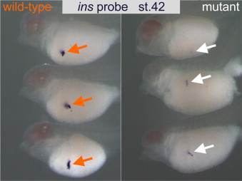 Fig. 8. insulin (ins) expression is downregulated in pax6 mutants. Wild-type (left) and pax6 mutant (right) embryos at stage 42 were subjected to in situ hybridization with an ins probe. Expression of ins gene in this lateral view of mutant embryos (white arrows) is reduced compared to the level seen in wild-type embryos (orange arrows). (For interpretation of the references to color in this figure legend, the reader is referred to the web version of this article.) |