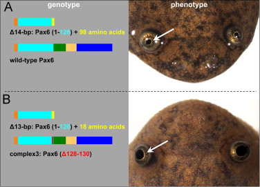 Fig. 9. Combination of truncated Pax6 protein and Pax6 protein with a small in-frame deletion causes an aniridia-like phenotype in X. tropicalis froglets. (A) An example of a heterozygous genotype (left) of phenotypically wild-type froglet (right). (B) An example of the compound heterozygous genotype (left) of an aniridia-like froglet (right). All other genotypes of aniridia-like froglets are listed in Table S1. |