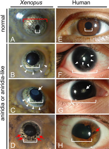 Fig. 10. Comparison of aniridia-like frog eyes with human aniridic eyes. For purposes of comparison the images of froglet eyes shown here are approximately half the size of the human eyes. Actual froglet corneal diameter is approximately one-tenth that of human. Normal frog (A) and human (E) eyes have small pupil (indicated by white brackets) and relatively large, pigmented iris. Aniridia-like mutant froglets (BâD) and human aniridia patients (FâH) show variable eye phenotypes including reduced (BâD, H) or absent (F and G) iris tissue. Remaining iris tissue may show focal losses (red arrows D and H). The lenses may be clear (B and F) or have a focal cataract (white arrows in C and G). Also, both frog and human eyes may show peripheral clouding of the cornea due to keratopathy (white arrowheads in B, C and F). (For interpretation of the references to color in this figure legend, the reader is referred to the web version of this article.) |