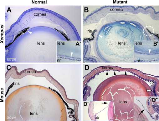 Fig. 12. Xenopus mutants for pax6 exhibit anterior eye defects comparable to those observed in Pax6 mutant mice. Histological sections cut through eyes from either wild-type (Normal) or Pax6 mutant (Mutant) X. tropicalis (Xenopus) and mice (Mouse) showing anterior structures. (A) Wild-type froglet eye. White arrowhead denotes lens epithelial cells. (Aâ²) High magnification view of lens epithelial cells in region of lens adjacent to retina. Dotted line denotes boundary between lens and retina. (B) pax6 Hypomorphic froglet eye. In addition to the eye being smaller, defects in the cornea, iris, and lens are evident. Circle indicates region with likely iridolenticular adhesion. (Bâ²) High magnification view of lens epithelial cells in region of lens adjacent to retina comparable to Aâ². Dotted line denotes boundary between lens and retina. Note expansion of acellular material between lens and retina compared to wild-type. (C) 8-Week-old adult wild-type mouse (D) 8-week-old adult Pax6Sey-Neu/+ mouse. Black arrowheads denote iridokeratotic adhesion. Open arrowhead denotes iris or ciliary tissues. (Dâ²) Arrow shows iridolenticular adhesion in section cut from different Pax6Sey-Neu/+ mouse. (Dâ²) Arrow shows iris hypoplasia typically observed in these Pax6Sey-Neu/+ mice; this section was cut from a third Pax6Sey-Neu/+ mouse at a plane comparable to that of the wild-type mouse in C. cb, ciliary body; nr, neuroretina. Scale bar in panel A applies to panel B; scale bar in C applies to panel D. Scale bars in Aâ², Bâ² and Dâ² denote 50 μm. Scale bar in Dâ² denotes 200 μm. |