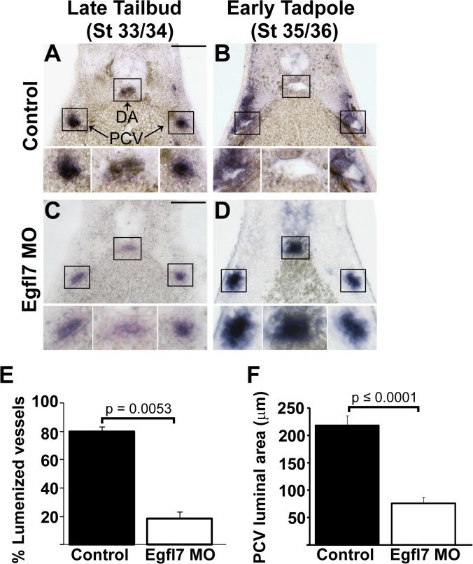 Fig 4. EGFL7 is required for lumen formation.(A-D). In situ hybridization with endothelial-specific Erg shows a requirement for EGFL7 in lumen formation of the dorsal aorta (DA) and posterior cardinal veins (PCV). (A). Endothelial cells coalesce at the appropriate positions of the DA and PCVs in late tailbud stage (stage 33/34) control embryos. (B). DA and PCV lumens become evident by early tadpole stage (stage 35/36) in control embryos. (C). Endothelial cells appear as aggregates in late tailbud stage (stage 33/34) EGFL7-depleted vessels similar to controls. (D). Lumens fail to form in early tadpole stage (stage 35/36) EGFL7-depleted embryos. 3â4 embryos from each condition/stage were assessed from at least three independent injection batches at the same position along the anterior-posterior axis of the embryo. Top image of each panel was taken at 20x magnification. Black boxes correspond to enlarged images of each vessel displayed below. Scale bars represent 20 μm. (E). Frequency of lumenized PCVs and DAs in early tadpole stage (stage 35/36) embryos. Lumens are detected in 81% of control embryos vs. 21% of EGFL7-depleted embryos. n = 209 control, n = 216 MO, three independent experiments. Student's t-test was used to calculate the p-value and bars represent ± SEM. (F). Measurement of the luminal area within the PCV in early tadpole stage (stage 35/36) embryos. The size of control lumens = 218 μm. Of EGFL7-depleted vessels that were lumenized, lumens were significantly smaller,75 μm. n = 70 control, n = 29 MO. A Mann-Whitney test was used to determine significance and bars represent ± SEM. |