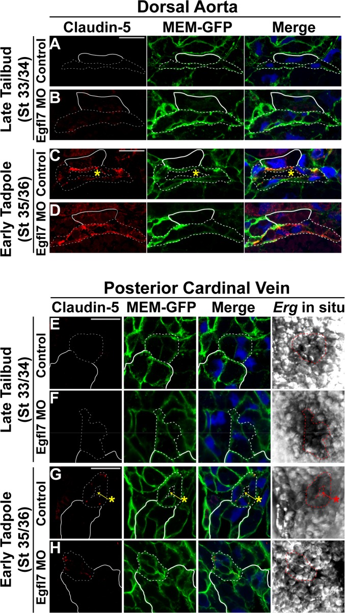 Fig 7. EGFL7 is required for junctional reorganization but not for the hierarchical assembly of tight junctions.(A-H). Representative confocal images of transverse sections of the dorsal aorta (DA) and posterior cardinal veins (PCV) stained with Claudin-5 (red), GFP to mark cell membranes (MEM-GFP; green), and DAPI to mark nuclei (blue). Phase contrast images for the PCVs represent the Erg in situ signal. All images taken at 63x magnification with scale bars indicating 20 μm. Dotted white and red lines in all panels delineate the endothelial cells comprising each vessel. As anatomical references, the hypochord in (A-D) and the kidney in (E-H) are indicated by solid white lines. (A-B). Claudin-5 expression is absent from endothelial cells of the DA in late tailbud stage (stage 33/34) control and EGFL7-depleted embryos. (C). Claudin-5 localizes to tight junctions between endothelial cells once the DA lumen has formed in early tadpole stage (stage 35/36) control embryos. (D). Claudin-5 expression is apparent in tight junctions between EGFL7-depleted endothelial cells of the DA despite failed lumen formation at early tadpole stage (stage 35/36). (E-F). Claudin-5 expression is absent from endothelial cells of the PCV in late tailbud stage (stage 33/34) control and EGFL7-depleted embryos. (G). Claudin-5 localizes to distinct tight junctions between endothelial cells around the periphery of the PCV lumen in early tadpole stage (stage 35/36) control embryos. (H). Claudin-5 localizes to tight junctions along endothelial cell contacts within the PCV of early tadpole stage (stage 35/36) EGFL7-depleted embryos. 3â4 embryos from each condition/stage were assessed from at least three independent injection batches at the same position along the anterior-posterior axis of the embryo. |