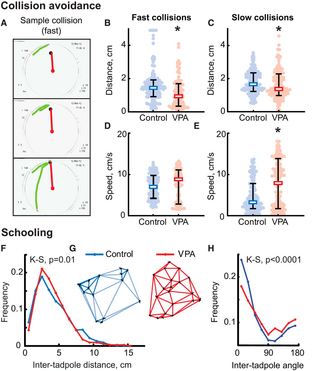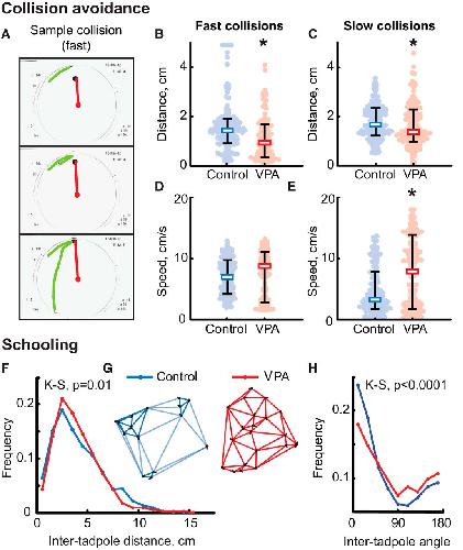 Figure 1. VPA-reared tadpoles show impaired visual avoidance and schooling behaviors. A, Three sample frames representing dynamics of a typical fast collision-avoidance maneuver (see Results). B, Reaction distance during collision avoidance from a fast-moving object; all points, median, and 20â80% quantiles are shown. Blue, Control tadpoles; red, VPA-reared tadpoles. C, Peak speed during avoidance maneuver from a fast-moving object. D, Reaction distance during avoidance from a slowly moving object. E, Peak speed during avoidance from a slowly moving object. F, Distribution of inter-tadpole distances during schooling for both control (blue) and VPA-reared (red) animals; control animals have higher representation of short and long distances but fewer middle distances compared with VPA-reared tadpoles. G, Typical distributions and orientations of control and VPA-reared animals in the bowl during schooling; control tadpoles (blue) tend to form clusters, whereas VPA-reared animals (red) are distributed evenly. H, Distribution of angles between orientations of neighboring tadpoles; VPA-reared animals are markedly less co-oriented. K-S, KolmogorovâSmirnov test. *p < 0.05 (MannâWhitney). |
