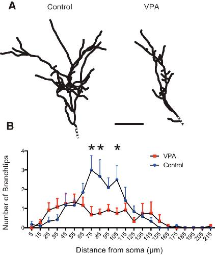 Figure 2. Abnormal dendritic morphology in VPA-reared tadpoles. A, Reconstructed dendritic arbors from representative tectal neurons from control and VPA-exposed tadpoles show different branching structure. Dotted line indicates the position of the soma. B, Three-dimensional Sholl analysis indicating the number of branch tips at different distances from the soma. Notice the differences in branch-tip distribution. Each group represents an average of 12 (control) and 13 (VPA) neurons, and error bars are SD. *p < 0.05. |