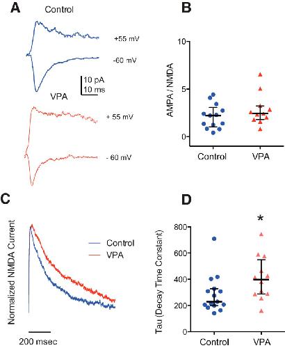 Figure 4. Effects of VPA rearing on synaptic maturation. A, Example traces of evoked AMPA-mediated (−65 mV) and AMPA/NMDA-mediated (55 mV) currents. B, Ratio of AMPA current peak/NMDA current amplitude. Control, n = 13; VPA, n = 11. Error bars indicate the IQR. C, Examples traces depicting isolated NMDAR-mediated currents from control and VPA-treated tadpoles. D, Scatter plot showing decay time constants of the NMDAR-mediated response. PMW = 0.03; control, n = 15; VPA, n = 12. Error bars are IQR. *p < 0.05. |