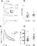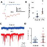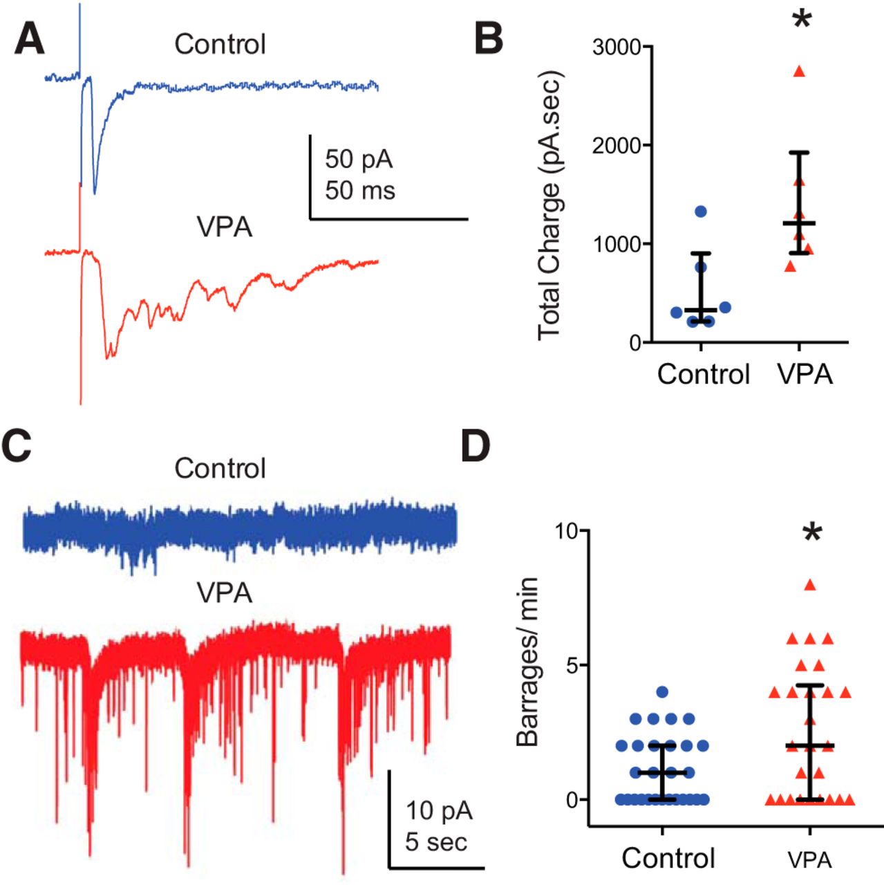 Figure 5. Exposure to VPA enhances recurrent connectivity in the optic tectum. A, Example traces of maximally evoked synaptic responses from control and VPA-treated tadpoles at −65 mV. Notice the enhanced polysynaptic activity in the VPA response. B, Total charge calculated over 100 ms from maximally evoked synaptic responses reflect increased polysynaptic activity in the VPA group. Mann–Whitney U test, p = 0.026, N = 6. Error bars are IQRs and medians. C, Example traces of spontaneous synaptic activity from control and VPA tectal cells (recorded at −65 mV with PTX in the external recording solution). D, The VPA group shows increased frequency of barrages. PMW = 0.038; control, n = 28; VPA, n = 26. Error bars are IQRs. *p < 0.05. |
