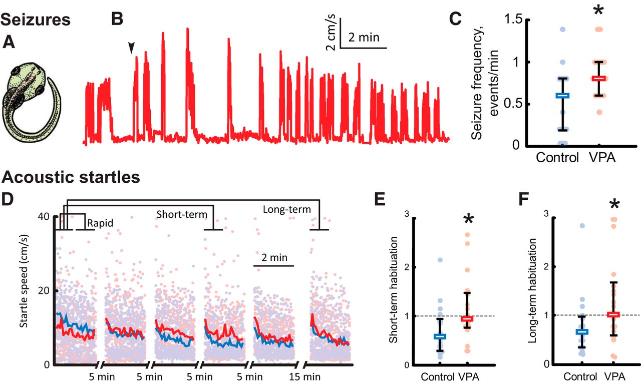 VPA-reared tadpoles exhibit increased seizure susceptibility and decreased acoustic startle habituation. A, A typical C-shaped bend exhibited by tadpoles during pharmacologically induced seizures. B, A sample trace of swimming speed evolution during a seizure protocol; onset of regular seizures is marked with an arrow. C, Comparison of seizures frequency during the first 5 min of testing for control (blue) and VPA-reared (red) tadpoles. All data, medians, and 20â80% quantiles are shown. D, Speed of acoustic startle responses in the acoustic habituation protocol; the plot shows all data points and averages across all tested animals in each group. Brackets on the top illustrate segments of data that were averaged and compared for each tadpole to produce estimations of rapid, short-term, and long-term habituation. E, Comparison of short-term habituation amount, defined as the ratio of average startle response amplitudes at different stages of habituation protocol (see Results), for control (blue) and VPA-reared (red) tadpoles. F, Comparison of long-term habituation amount for control and VPA-reared tadpoles. *p < 0.05. |