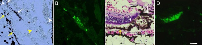 Figure 2. BrdU labeling of stem/progenitor cells at the early stage of regeneration (day 5) (A, B) and late stage (day 20) (C, D).(A, B) At the early stage, there is an actively proliferating cell zone (asterisk in A) juxtaposed to the presumable ciliary marginal zone (CMZ) (yellow arrowhead) and the iris (white arrowhead). This proliferating cell zone (progenitor cells) appear continuous to the newly formed retinal pigmented epithelial (RPE) layer (white arrow). The original RPE layer is shown by yellow arrows. A is a phase contrast micrograph image and is identical to B. (C, D) At the later stage, there is another progenitor cell clusters (asterisk) at the posterior end of regenerating retina. There still remain some RPE cells (white arrow). The original RPE is shown by a yellow arrow. C is a micrograph of a section stained with hematoxylin and eosin, and is identical to D. Scale bar in D is 45 μm and applied to AâC.