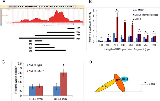 Mesoderm Inducer in Xenopus Like1 (MIXL1), a paired-type homeobox transcription factor induced by TGF-β family of ligands is required for early embryonic specification of mesoderm and endoderm. Retrovirally transduced Mixl1 is reported to induce acute myelogenous leukemia (AML) with a high penetrance. But the mechanistic underpinnings of MIXL1 mediated leukemogenesis are unknown. Here, we establish the protooncogene c-REL to be a transcriptional target of MIXL1 by genome wide chromatin immune precipitation. Accordingly, expression of c-REL and its downstream targets BCL2L1 and BCL2A2 are elevated in MIXL1 expressing cells. Notably, MIXL1 regulates c-REL through a zinc finger binding motif, potentially by a MIXL1-Zinc finger protein transcriptional complex. Furthermore, MIXL1 expression is detected in the cancer genome atlas (TCGA) AML samples in a pattern mutually exclusive from that of HOXA9, CDX2 and HLX suggesting the existence of a core, yet distinct HOX transcriptional program. Finally, we demonstrate MIXL1 to be induced by BMP4 and not TGF-β in primary human hematopoietic stem and progenitor cells. Consequently, MIXL1 expressing AML cells are preferentially sensitive to the BMPR1 kinase inhibitor LDN-193189. These findings support the existence of a novel MIXL1-c REL mediated survival axis in AML that can be targeted by BMPR1 inhibitors. (MIXL1- human gene, Mixl1- mouse ortholog, MIXL1- protein).