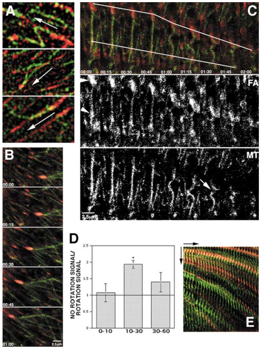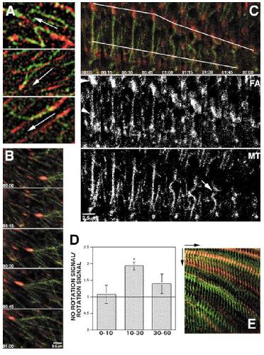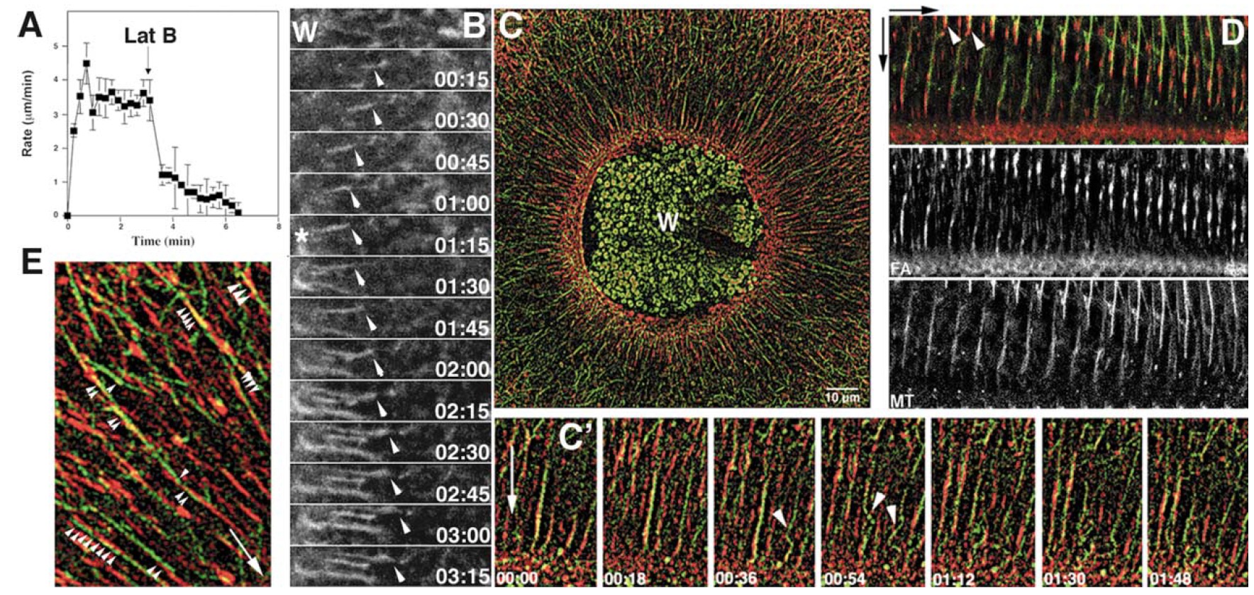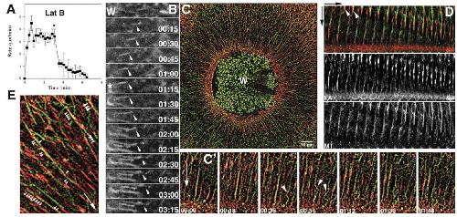 (E) Dual-label image from a movie showing microtubules (green) aligned with F-actin (red; alignment indicated by arrowheads).