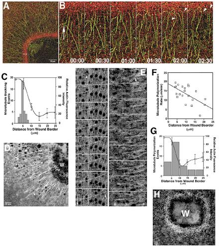(C) Microtubules move to the wound (arrow) in association with F-actin and buckle upon reaching the wound edge (arrowheads). See Movie 6.