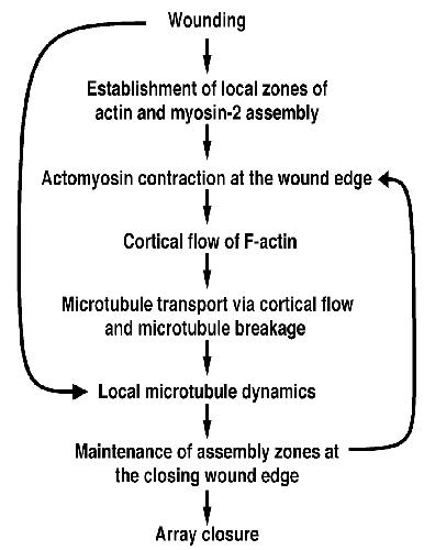 CONCLUSIONS: The results reveal transport of microtubules in association with F-actin that is pulled to wound borders via actomyosin-based contraction. Microtubules, in turn, focus zones of actin assembly and myosin-2 recruitment at the wound border. Thus, wounding triggers the formation of a spatially coordinated feedback loop in which transport and assembly of microtubules maintains actin and myosin-2 in close proximity to the closing contractile array. These results are surprisingly reminiscent of recent findings in locomoting cells, suggesting that similar feedback interactions may be generally employed in a variety of fundamental cell motility processes.