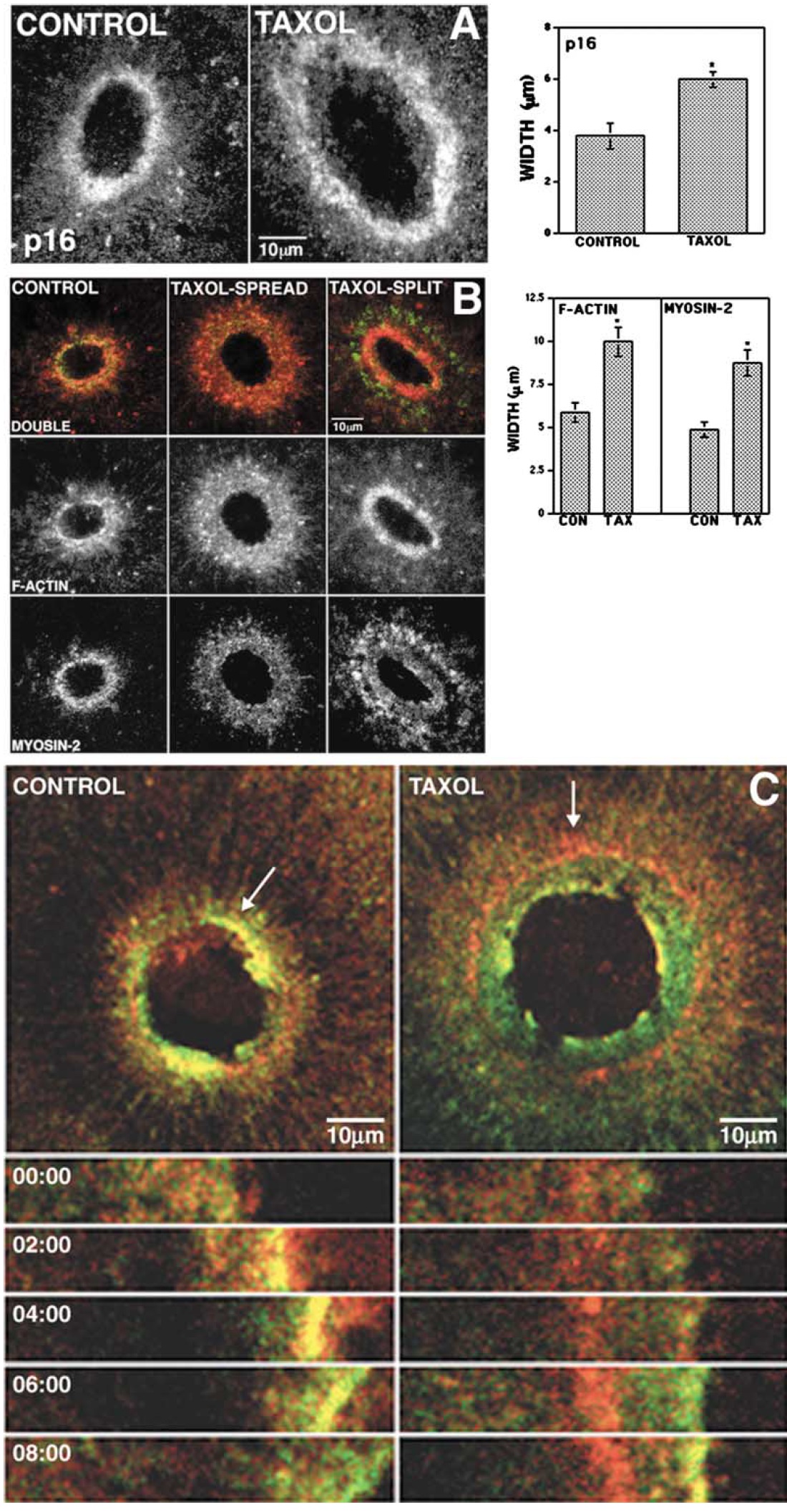 (C) Double-labeled image from a movie of an oocyte injected with OG-Tax (green) and Alexa 568-phalloidin (red). See Movie 5.