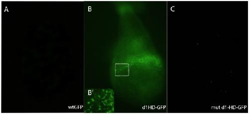 Figure 4. Uptake of d1-HD-GFP and GFP by Drosophila imaginal wing discs.Drosphila imaginal wing discs were incubated with Hoxd1-HD-GFP (d1-HD-gfp) recombinant protein (B) or wild type GFP protein (A). or mutated mut-d1-HD-GFP. Recombinant d1-HD-gfp was taken up by the discs while wild type GFP and mut-d1-HD-GFP were not. Each photo in this figure represents 10 imaginal discs giving the same result. These data clearly show the cargo function of Hoxd1 homeodomain and suggest that this uptake is by a species independent mechanism.