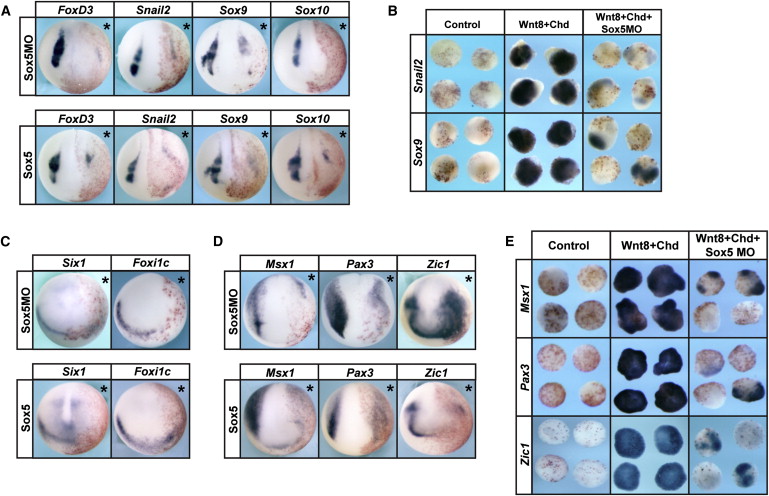 Figure 1. Sox5 Is Required for NC and NPB Formation (A) In situ hybridization examining FoxD3, Snail2, Sox9, and Sox10 in Xenopus embryos injected with Sox5 MO or Sox5 mRNA. Embryos were collected at midneurula stages (stage 17). Asterisk denotes injected side with β-galactosidase (β-gal) staining (red) as lineage tracer. (B) Explant assay examining Snail2 and Sox9 in Wnt8/Chordin-induced explants that were injected with Sox5 MO. Explants were collected alongside sibling embryos cultured to midneurula stages (stage 17). (C) In situ hybridization examining Six1 and Foxi1c in embryos injected with Sox5 MO or Sox5 mRNA. Embryos were collected at early neurula stages (stage 13). (D) In situ hybridization examining Msx1, Pax3, and Zic1 in embryos injected with Sox5 MO or Sox5 mRNA. Embryos were collected at early neurula stages (stage 13/14). (E) Explant assay examining Msx1, Pax3, and Zic1 in Wnt8/Chordin-induced explants that were injected with Sox5 MO. Explants were collected alongside sibling embryos cultured until early neurula stages (stage 14). Asterisk denotes injected side with β-gal staining (red) as lineage tracer. See also Figure S1. |