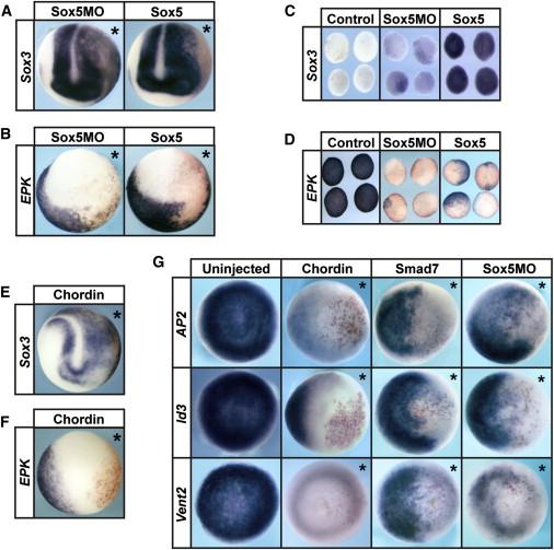 Figure 2. Misregulating Sox5 Phenocopies Loss of BMP Signaling (A and B) In situ hybridization examining Sox3 (A) and EPK (B) in embryos injected with Sox5 MO or Sox5 mRNA. Embryos were collected at early neurula stages (stage 13). (C and D) Explant assay examining Sox3 (C) and EPK (D) in explants that were either injected with Sox5 MO or Sox5 mRNA. Explants were collected alongside sibling embryos cultured until early neurula stages (stage 13). (E and F) In situ hybridization examining Sox3 (E) and EPK (F) in embryos injected with Chordin mRNA showing a similar loss of EPK and expanded expression of Sox3. Embryos were collected at early neurula stages (stage 13/14). Asterisk denotes injected side with β-gal (red) as lineage tracer. (G) In situ hybridization examining AP2, Id3, and Vent2 at blastula stages. Embryos were injected with Chordin, Smad7, or Sox5 MO and collected at stage 9. Asterisk denotes injected side with β-gal staining (red) as lineage tracer. See also Figure S2. |