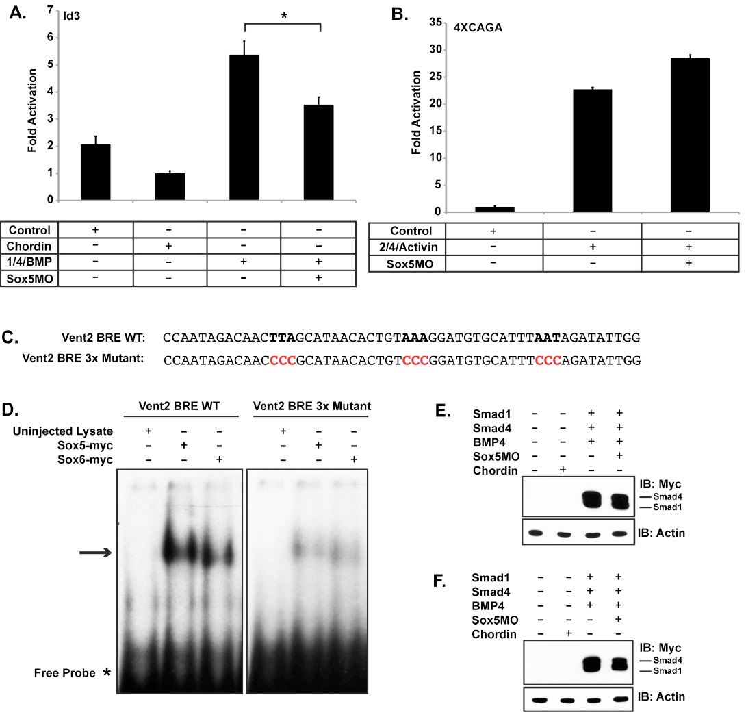 Figure S3. Related to Figure 3. Sox5 is required for BMP target activation (A) Luciferase assay examining fold activation of the Id3 promoter. Reporter activation by active Smad1/4 is significantly diminished when Sox5 is depleted. p=0.0052 (B) Luciferase assay examining fold activation of the 4XCAGA reporter. Reporter activation by active Smad 2/4 is not diminished when Sox5 is depleted. Experiments were repeated three times and error bars represent standard deviation of three replicates. (C) Vent2 BRE sequence within the luciferase reporter. Bolded sequences are within putative Sox5 binding sites that were mutated from AT rich sequence to C rich sequence (red). (D) EMSA using the Vent2 BRE Wildtype sequence or the mutated sequence as a probe. Mutations greatly reduce Sox5 and Sox6 binding to this element. (E,F) Western blots of embryo lysates injected for luciferase assays in Figure 3E,F. Embryos injected for Vent2 reporter (E) and 12XGCCG reporter (F). |