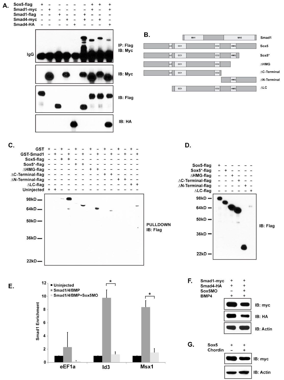 Figure S4. Related to Figure 4. Physical mapping of Sox5 with Smad1 and Sox5 is required to recruit Smad1 to the Msx1 and Id3 promoters. (A) Co-immunoprecipitation examining interaction between Sox5 and Smad1 or Smad4. Lysates from embryos expressing the noted epitope tagged proteins were immunoprecipitated (IP) with anti-flag antibodies and immunoblotted (IB) using anti-myc antibodies. Direct immunoblotting of lysate with either myc, flag, or HA antibodies served as input control (bottom panels). (B) Schematic representations of Sox5 deletion constructs used in GST pulldown assays. (C) GST pulldown assay using Xenopus embryo lysates that were either uninjected, injected with Sox5 wildtype mRNA or Sox5 deletion constructs shown in (B). Lysate was incubated with glutathione beads coupled to GST or Smad1-GST. (D) Western blot showing the expression levels of the Sox5 deletion proteins used in (C). (E) ChIP analysis examining Smad1 enrichment on eEF1α, Id3 and Msx1 promoters. Smad1 enrichment is significantly diminished when Sox5 is depleted. Embryo lysates were immunoprecipitated with antibodies against the epitope tag in Smad1 (myc). Fold Enrichment is obtained by normalizing to uninjected sample. Error bars represent S.E.M. of three independent biological experiments. Id3 p=0.0207, Msx1 p=0.0274. (F) Western blot of embryo lysates injected for Smad1 Chromatin immunoprecipitation (Figure 4E,F). Three biological replicates were used and the expression for factors was analyzed for each experiment. (G) Western blot of embryo lysates injected for Sox5 Chromatin immunoprecipitation (Figure 4G,H). Three biological replicates were used and the expression for factors was analyzed for each experiment. |