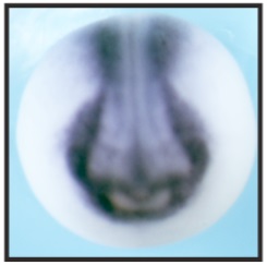 sox6 (SRY-box 6) gene expression in Xenopus laevis embryo, assayed via in situ hybridization, NF stage 20, dorsal view, anterior down. |