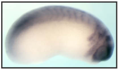 sox6 (SRY-box 6) gene expression in Xenopus laevis embryo, assayed via in situ hybridization, NF stage 28, lateral view, anterior right, dorsal up. |