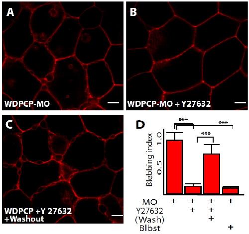 1 hour washout of Y27632. (D) Quantification of blebbing index; Wdpcp-MO n = 24;