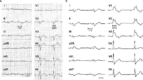 Figure 1. Twelve-lead electrocardiography (ECG) of a patient with progressive cardiac conduction disorder (PCCD) and idiopathic ventricular fibrillation (IVF)In 2003, heart rate (HR) 79 bpm, PQ interval 205 ms (marked by a dotted line), QRS 115 ms (continuous line), QT 351 ms, and corrected QT interval 402 ms.In 2008, HR 59 bpm, PQ interval 211 ms (dotted), QRS 166 ms (continuous), QT 433 ms, and QTc interval 427 ms (measurements each in lead II; paper speed 50 mm/s, scale bar 10 mm).