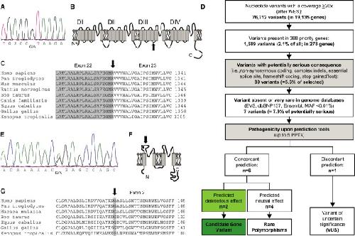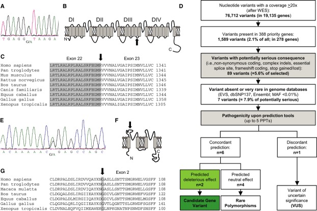 Figure 2. Heterozygous, digenic mutation state (KCNK17 and SCN5A) in patient 10192-1Electropherogram after direct sequencing of SCN5A: in the essential donor splice site located in intron 22, a heterozygous nucleic acid substitution was identified (c.3963+1G>A).Schematic topology of the Nav1.5 α-subunit. The affected splice site (black arrow) is located in the intracellular linker between the transmembrane segments S4 and S5 of domain 3 (DIII).Alignment of the boundary of exon 22/exon 23, position of the mutation is indicated by a black arrow. A skipping of exon 22 is predicted.Prioritization scheme for filtering variants obtained by whole-exome sequencing (WES). Minimum read depth was 20×. First, filtering of variants for relevant heart genes was done. Next, all variants with non-serious consequences (synonymous and mostly intronic changes) were excluded. Only unknown or rare alterations (MAF < 0.01%) were further evaluated with pathogenicity prediction programs (nsSNV: PolyPhen-2, SIFT, MutPred, SNPs&Go, SNAP; in-frame indels: SIFT/Provean; frameshift, splice site variants: Alamut). If all programs concordantly predict a damaging effect, the related gene was classified as a candidate gene. Discrepant prediction results lead to a classification as a variant of uncertain significance (VUS).Electropherogram after direct sequencing of KCNK17. A heterozygous nucleic acid substitution (c.262G>A) was detected in exon 2 of the KCNK17 gene.Schematic topology of the TASK-4 α-subunit with the point mutation p.Gly88Arg located in the extracellular linker between the first two transmembrane domains.Alignment illustrating the high degree of conservation of G88 between orthologs of TASK-4.