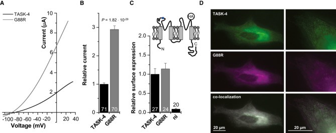 Figure 4. The p.G88R mutation in TASK-4 results in a gain-of-function in presence of a normal cellular distribution pattern and cell surface expressionRepresentative two-electrode voltage-clamp measurements in Xenopus oocytes injected with wild-type (black) or mutant (p.G88R, gray) TASK-4 cRNA (25 ng/oocyte). Voltage was ramped from −110 to +35 mV within 3.5 s. Holding potential was −80 mV and voltage ramps were repeated every 4 s.Mean current amplitudes of wild-type- and G88R-TASK-4-mediated currents were analyzed at 0 mV from six independent sets of experiments. Relative current: TASK-4 = 1.0 ± 0.04 (n = 71) and G88R-TASK-4 = 2.93 ± 0.13 (n = 70).Luminometric quantification of the surface expression of HA-tagged TASK-4 constructs. Relative surface expression normalized to wild-type TASK-4 is plotted. ni: non-injected oocytes. TASK-4 = 1.0 ± 0.15 (n = 27); G88R-TASK-4 = 1.14 ± 0.15 (n = 24); ni = 0.09 ± 0.02 (n = 20). The inset illustrates the membrane topology of a TASK-4 α-subunit and the localization of the HA-tag introduced in the P2-M4 linker. The position of the G88R mutation is indicated in blue.Live-cell imaging of HeLa cells 22 h after transfection with EGFP-tagged wild-type and DsRed-tagged G88R-TASK-4 channels.