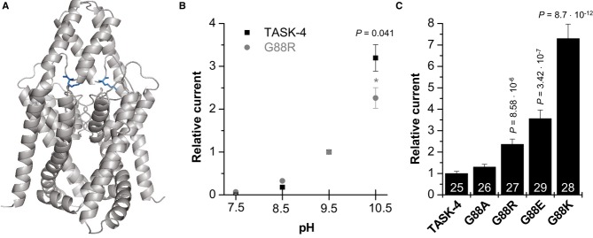 Figure 5. Glycine residue 88 is critical for the gating of TASK-4 channelsLocalization of the G88 residue in a TASK-4 pore homology model based on the crystal structure of TWIK-1. The arginine (R) residues within the dimer are illustrated in blue.Wild-type TASK-4 and G88R-TASK-4 channel sensitivity to external pH. Mean current amplitudes were recorded by 1-s test pulses to +40 mV, repeated every 4 s. Holding potential was −80 mV. Current amplitudes were analyzed at the end of the test pulse, with extracellular pH values ranging from 7.5 to 10.5. Data were normalized to the currents recorded at pH 9.5 and illustrated as mean ± SEM.Mean current amplitude of oocytes injected with wild-type TASK-4 cRNA (n = 25), G88A (n = 26), G88R (n = 27), G88E (n = 29), or G88K (n = 28) mutant TASK-4 cRNA subjected to a 1-s test pulse to +40 mV (protocol as described above). Mean current amplitude at +40 mV was plotted relative to the currents generated by wild-type TASK-4 channels.