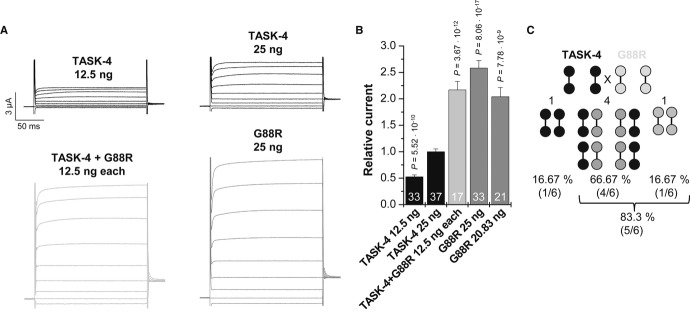 Figure 6. G88R mutant TASK-4 channel subunits have a dominant-active effect on wild-type TASK-4 subunitsRepresentative current voltage relationship measurements in Xenopus oocytes injected with wild-type TASK-4 cRNA (25 ng/oocyte, black), with 12.5 ng wild-type TASK-4 (mimicking haploinsufficiency), with wild-type TASK-4 and G88R-TASK-4 cRNA (12.5 ng each/oocyte, light gray) mimicking an heterozygous state or G88R mutant cRNA alone (25 ng/oocyte, gray). Voltage was stepped from a holding potential of −80 mV to potentials ranging from −100 mV to +60 mV in 20 mV increments. Voltage step duration was 200 ms and voltage steps were repeated every 2 s. Test pulses were followed by a step to −40 mV.Mean current amplitude at 0 mV is blotted relative to TASK-4 wild-type currents (25 ng). Relative TASK-4 current after injection of 20.83 ng G88R-TASK-4 cRNA is thought to resemble the theoretical amount of dimeric channels containing at least one G88R subunit (83.3%). Data are provided as mean ± SEM. P values calculated in unpaired Student's t-test are indicated. Numbers of independent experiments are indicated within the bars.Theoretical probability of dimeric subunit assembly after injection of similar amounts of wild-type and G88R-TASK-4 channel subunits.
