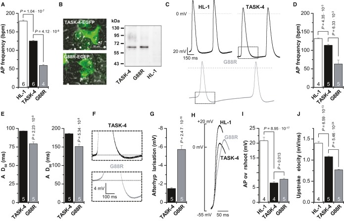 Figure 7. G88R mutants stabilize the membrane potential and slow upstroke velocity of spontaneously beating HL-1 cellsAction potential (AP) frequency, as beats per minute (bpm), of spontaneously beating HL-1 cells and of HL-1 cells transfected with TASK-4-EGFP or G88R-EGFP, was counted in supplemented Claycomb media. Beating frequency was determined from four to six independent transfections and dishes with untransfected HL-1 cells.Fluorescence imaging and Western blot analyses of HL-1 cells transfected with TASK-4-EGFP or G88R-EGFP. For Western blot analysis, TASK-4 or G88R was detected with an anti-GFP antibody. HL-1, non-transfected HL-1 cells.Patch clamp experiments in the current-clamp mode of HL-1 cells and HL-1 cells transfected with TASK-4-EGFP or G88R-EGFP. Boxes indicate the zoom area for panel F. The analyses of the patch clamp data in (D–J) were performed from four to five independent transfections for TASK-4 and G88R, respectively.Action potential (AP) frequency, as beats per minute (bpm), of spontaneously beating HL-1 cells and of HL-1 cells transfected with TASK-4-EGFP or G88R-EGFP, recorded in the current-clamp mode under physiological saline conditions.Analyses of the action potential duration, APD50 and APD90, of HL-1 cells transfected with TASK-4-EGFP or G88R-EGFP.Illustration of the hyperpolarization observed following an action potential of HL-1 cells transfected with TASK-4-EGFP or G88R-EGFP.Analyses of the afterhyperpolarization observed in HL-1 cells transfected with TASK-4-EGFP or G88R-EGFP.Illustration of the action potential overshoot and the upstroke velocity of HL-1 cells and of HL-1 cells transfected with TASK-4-EGFP or G88R-EGFP. Note that the threshold for the action potentials was not significantly different for the constructs.Analyses of the action potential (AP) overshoot of HL-1 cells and HL-1 cells transfected with TASK-4-EGFP or G88R-EGFP.Analyses of the upstroke velocity (mV/ms) of HL-1 cells and HL-1 cells transfected with TASK-4-EGFP or G88R-EGFP.