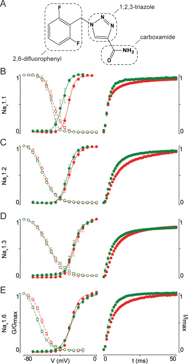 100 μM rufinamide to hNav1.1 (B), hNav1.2 (C), hNav1.3 (D), and hNav1.6 (E). All