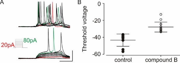 treated cells (80 pA), respectively. (B) Average action potential