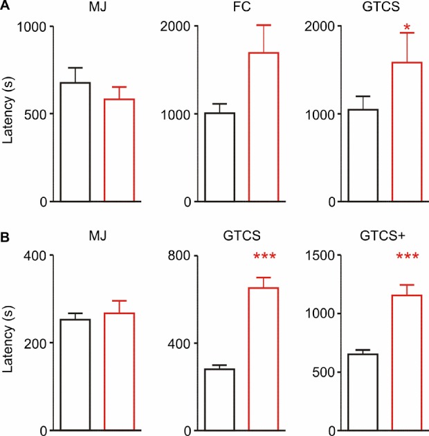 (B) The latencies to the MJ, GTCS, and GTCS with hind limb extension