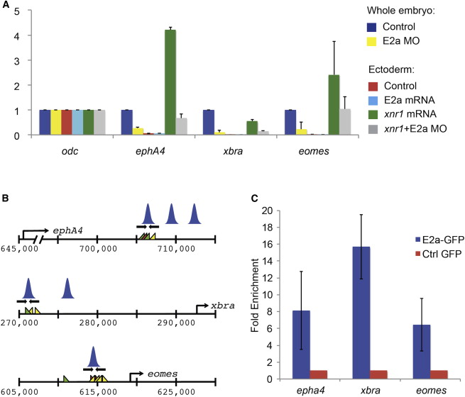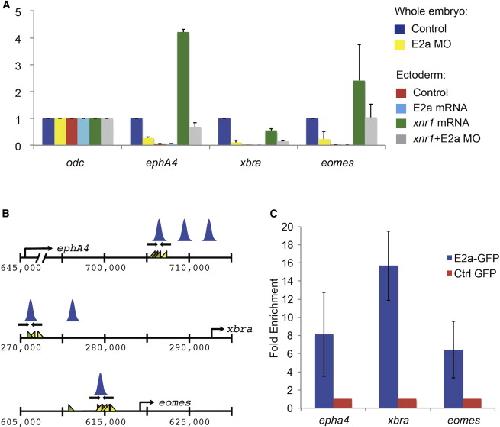 (C) ChIP-qRT-PCR for mE2a-GFP shows significant enrichment at regulatory regions for eomes, xbra, and epha4. qRT-PCRs are normalized to expression in embryos injected with GFP alone, and to expression of an off-peak primer. Error bars represent SDs of two to three biological replicates.