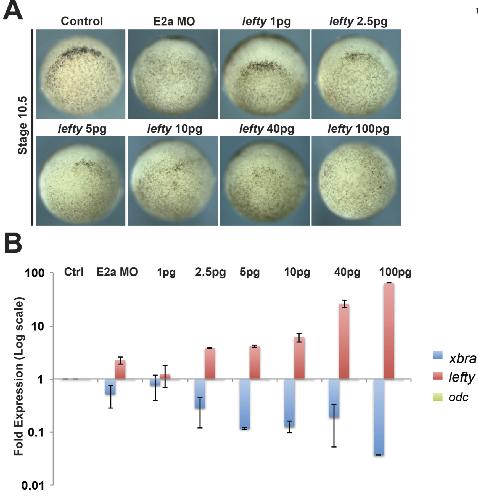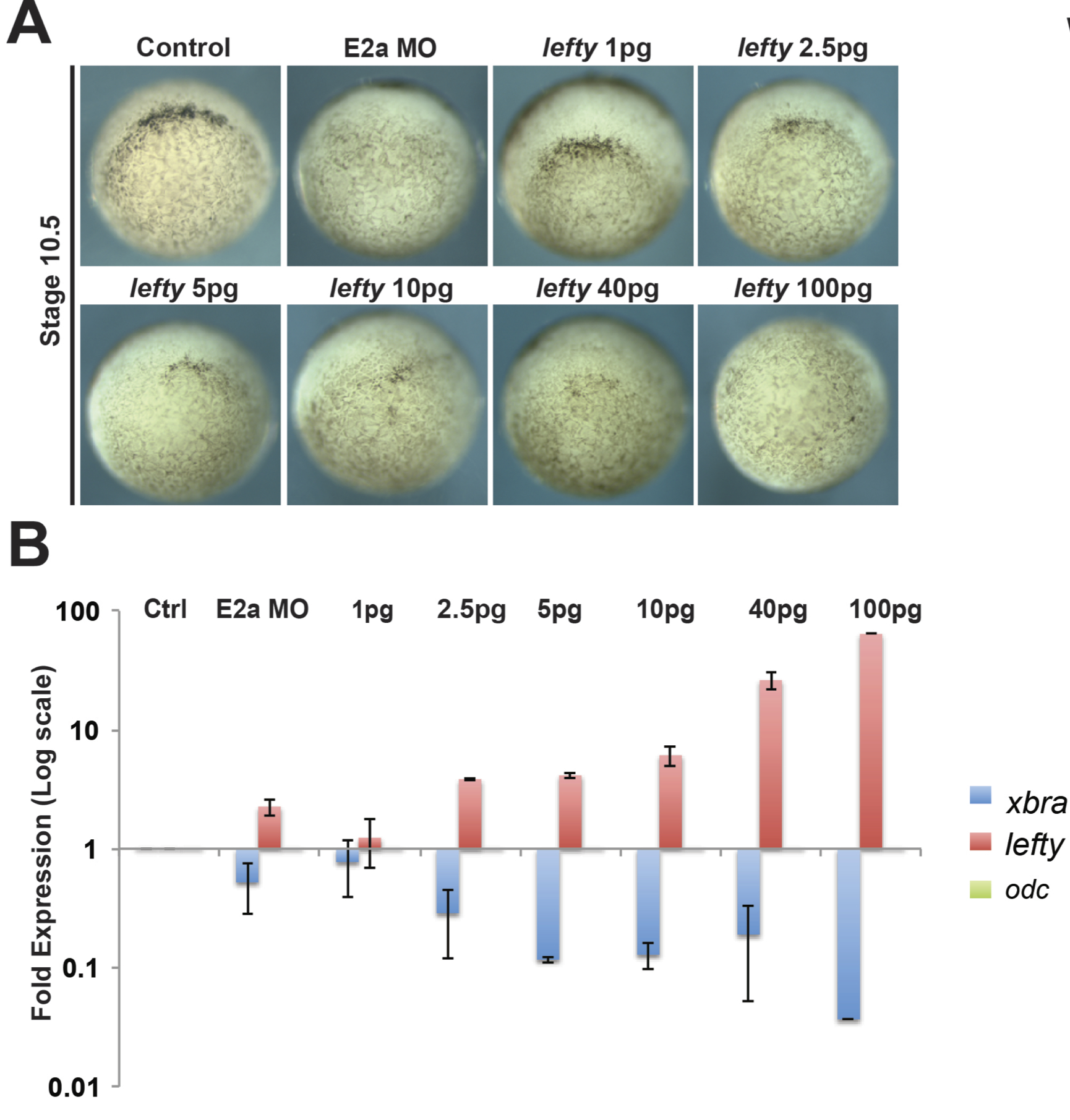 bottle cell and blastopore formation. At 1pg total lefty mRNA, blastopore formation is not inhibited, and at 2.5pg, it is only modestly inhibited, while blastopore formation is significantly impaired at 10pg or more of lefty mRNA. B) qRT-PCR comparing the effects of E2a MO injection with lefty mRNA injection at a range of doses. The amount of injected lefty mRNA is indicated across the top of the graph. The amount of lefty mRNA expressed in E2a morphants is comparable to injection of between 1 and 2.5pg lefty mRNA.