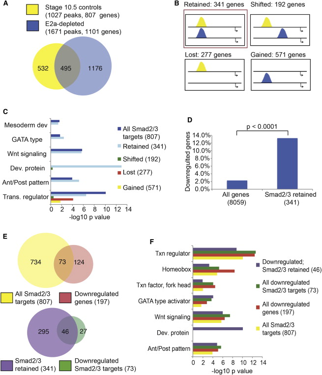 (A) Smad2/3 targets 1,027 distinct genomic regions in control stage 10.5 embryos (yellow) and 1,671 regions in E2a-depleted embryos (blue). Four hundred ninety-five regions are targeted in both conditions.