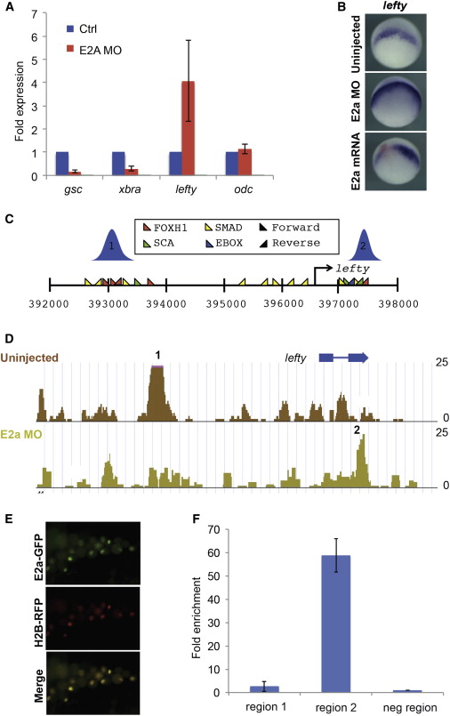 Figure 2. E2a Regulates Samd2/3 Positioning at lefty and Represses lefty Transcription (A) qRT-PCR showing upregulation of lefty in E2a-depleted embryos and downregulation of gsc and xbra. odc is shown as a loading control (Ctrl). Error bars represent SDs for three biological replicates.