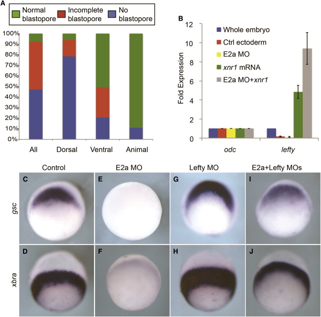 (CâJ) E2a-depleted embryos have reduced expression of gsc (E) and xbra (F) compared with uninjected control embryos (C and D). By contrast, Lefty-depleted embryos show increased expression of gsc (G) and xbra (H). Embryos injected with both E2a and Lefty MOs have moderate expression of gsc (I) and xbra (J).
