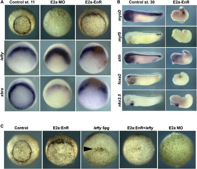 (A) Effects of E2a-EnR injection (both cells at the two-cell stage) at stage 11. Embryos injected with E2a-EnR have delayed blastopore closure relative to uninjected control embryos but far better blastopore formation than E2a morphants. Stage 10.5 E2a-EnR embryos express more xbra than E2a morphants but less than control embryos. E2a-EnR-injected embryos express less lefty than E2a morphants.