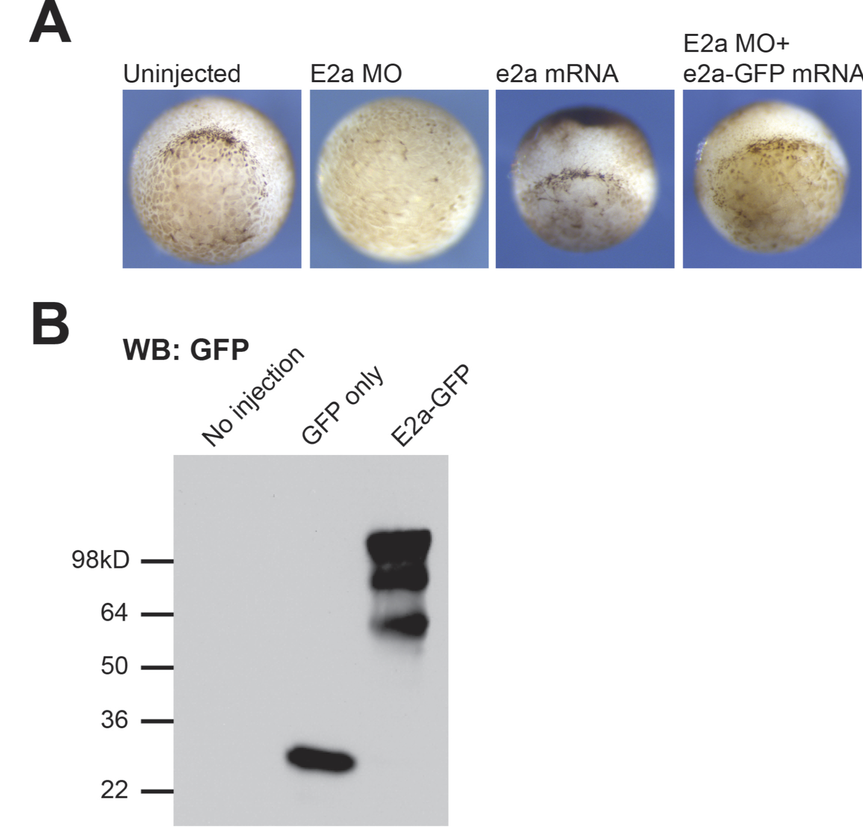 The E2a-GFP fusion protein is functional. A) Embryos were injected at the two cell stage with E2a MO, E2a-GFP mRNA, or E2a MO and E2a-GFP mRNA. Embryos injected with E2a MO fail to form blastopores. E2a-GFP RNA alone has no effect on blastopore formation. Embryos injected with both E2a MO and E2a- GFP have rescued bottle cell formation. B) Western blot for GFP. Embryo lysates were collected from embryos injected with mRNA encoding GFP alone, or E2a-GFP.