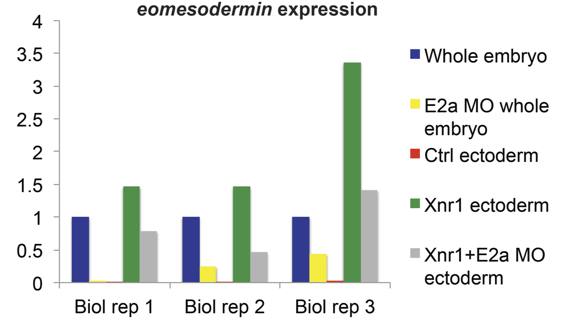 Expression of eomesodermin is reproducibly reduced by E2a MO injection. Related to Figure 4. qRT-PCR of eomesodermin in 3 biological replicate clutches of embryos. These data were combined in Figure 4A of the main text. Note that while eomes expression in Xnr1 injected ectoderm is variable between clutches, expression is always reduced in embryos that are injected with both Xnr1 and E2a MO