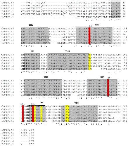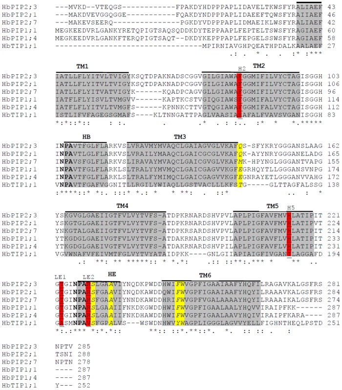 Fig 2. Multiple sequence alignment of HbPIP2;3 with aquaporins reported in rubber tree.Sequences were aligned using ClustalX2 [47]. Predicted transmembrane helices (TM1-TM6) and the two short helices forming NPAs (HB and HE) are shaded and labeled with black lines above the alignment. The two conserved NPA motifs are shown in bold letters. Residues comprising the ar/R filter are underlined and labeled H2, H5, LE1 and LE2. P1–P5 residues from N- to C-terminus are indicated by italic.