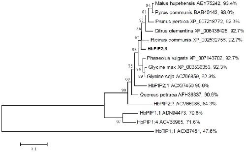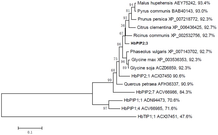 Fig 3. Phylogenetic analysis of HbPIP2;3 with other aquaporins.Predicted amino acid sequences were aligned using ClustalX2 [47] and the phylogenetic tree was constructed using bootstrap neighbour-joining tree (1000 replicates) method and MEGA4 software [48]. The distance scale denotes the number of amino acid substitutions per site. The similarity of each protein with HbPIP2;3 is shown on the right.