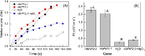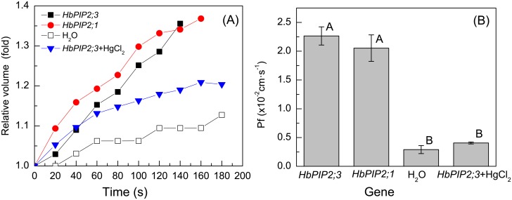Fig 4. Water channel activity of HbPIP2;3.(A) Time-dependent cell volume changes and, (B) water permeability (Pf) values of Xenopus oocytes expressing rubber tree aquaporins. The oocytes were injected with 50 ng HbPIP2;3 and HbPIP2;1 (positive control) cRNA solution or RNase-free water (negative controls) were incubated in full strength MBS for 24 h and then transferred into a 5-fold diluted MBS at time 0 for cell volume measurements. The cell volume change was recorded every 20 s for up to 200 s or until the cell burst. The oocytes for the HgCl2 inhibition group were subjected to treatment with MBS containing 0.3 mM HgCl2 10 min before the swelling assay. The Pf data are given as mean ± SD (n = 10) from two independent experiments. Bars with different letters are significantly different (Duncan one-way ANOVA, P<0.05).