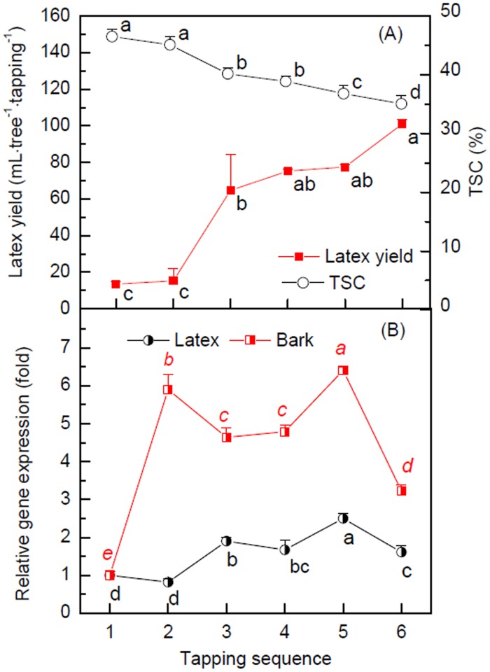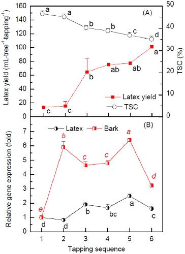 Fig 7. Effect of consecutive tappings on latex yield and HbPIP2;3 expression.(A) Latex yield and total solid content (TSC), (B) HbPIP2;3 transcript variation of virginal CATAS7-33-97 rubber trees subjected to six consecutive tappings. Data are means from three different trees and SD (n = 3). Different letters signify statistical differences between means at P<0.05.
