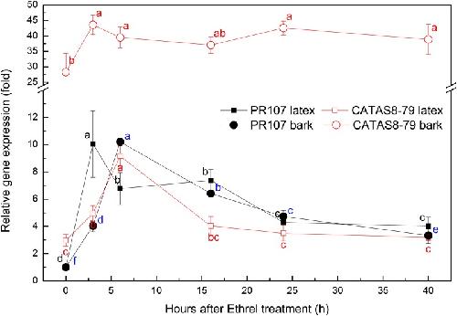 Fig 10. Variations of HbPIP2;3 transcripts following Ethrel stimulation.The PR107 and CATAS8-79 rubber trees regularly tapped for three years were used as the plant materials. The reference gene was HbYLS8 and the relative expressions of HbPIP2;3 in the latex and bark samples of both PR107 and CATAS8-79 rubber clones were calibrated respectively by using the PR107 latex and bark samples without Ethrel stimulation (i.e. 0 hour after treatment) as the control sample. Data are means ± SD (n = 3). Different letters indicate that the transcript expression of HbPIP2;3 was significantly different (P<0.05) among various treatment durations in the same clone.