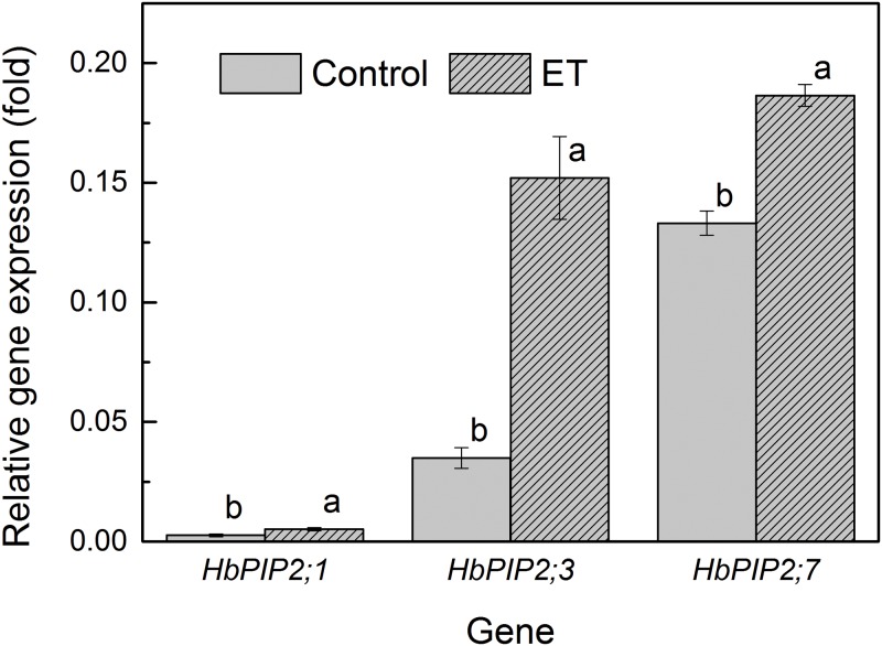 Fig 5. Relative transcript abundance of HbPIP2;1, HbPIP2;3 and HbPIP2;7 aquaporins in rubber tree latex.The relative gene expression is the ratio of each aquaporin transcript to the HbYLS8 house-keeping gene using 2Δt method. The PR107 rubber trees regularly tapped for three years without Ethrel stimulation were used as the plant materials. The Control rubber trees were brushed with only 1g of 1% CMC, while the 24h rubber trees were brushed with 1g of 2.5% (w/w) Ethrel in 1% CMC, at just above the tapping cut 24 hour before sampling. Different letters indicate a significant difference (P<0.05) in gene transcript expression between control and Ethrel-treated trees.